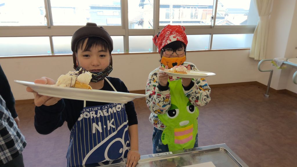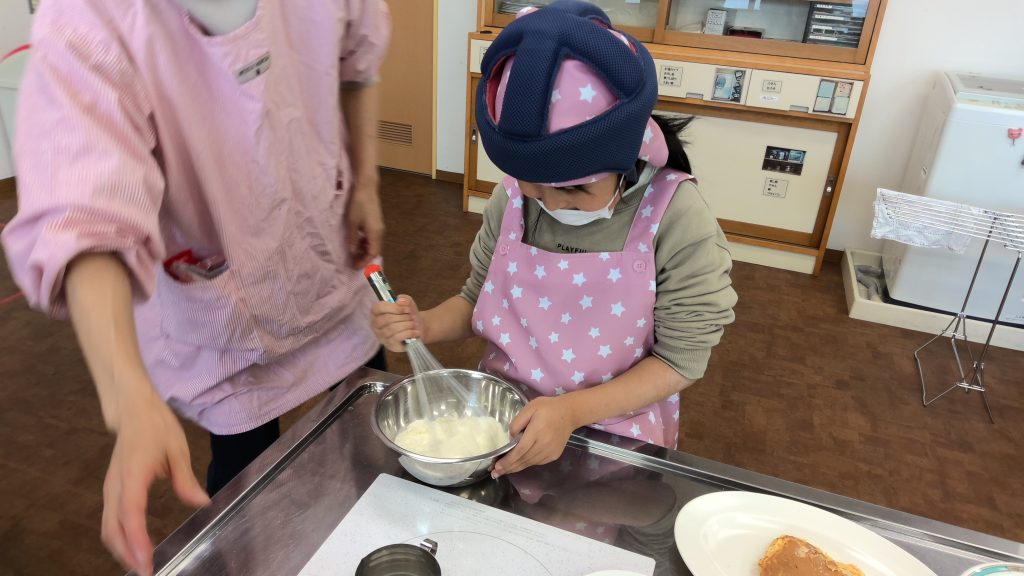 学校生活/小学部 小学部3・4・5年1組 「調理実習~ホットケーキをつくろう~」 2025年12月24日 生活単元学習「わくわくパーティー」でホットケーキ作りをしました。事前学習で、目盛りまで水を入れる練習や、模型のホットケーキをフライ返しで裏返すことに挑戦しました。当日はみんなで楽しくホットケーキを作りました。