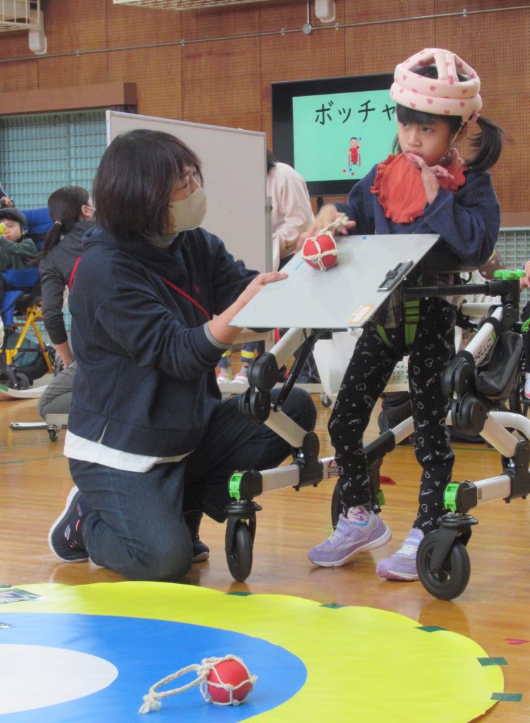 訪問教育のみんなもスポーツ大会に向けてボッチャやダンスをがんばりました。傾斜板に乗せたボールから手を離して転がしたり、先生に合図をしてから一緒に転がしたり、それぞれの方法で的に向かってボールを転がしました。