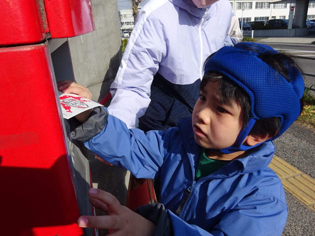 心をこめて作った年賀状を、学校近くのポストに投函しました。「とどきますように」とドキドキしながら入れました。 ポストの前では、にこにこ笑顔がいっぱい。届く日を楽しみにしています。