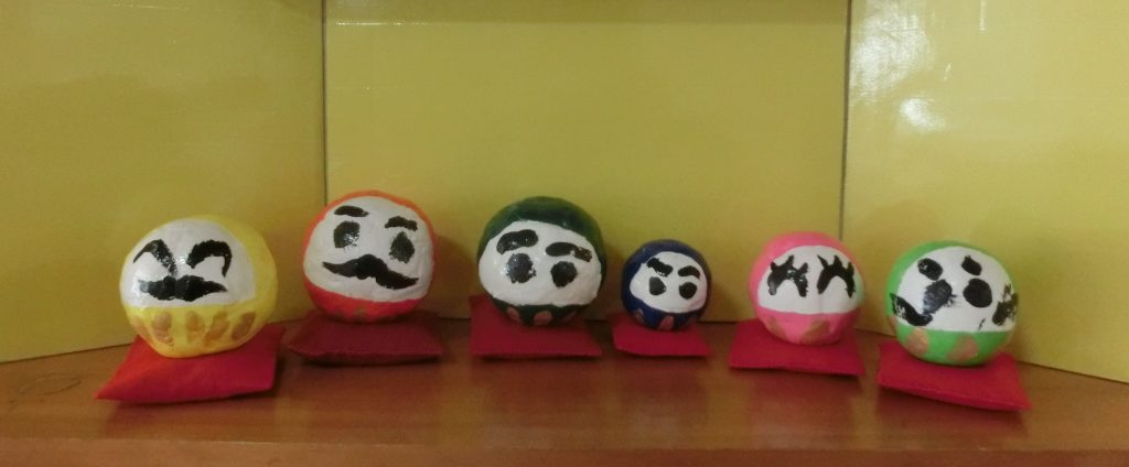 3学期のはじめに、今年の干支「うま」「午」の書き初めをしました。指筆や柄の長い筆を書き比べ、書きたい方の筆を選んで書きました。また、粘土でだるまを作りました。粘土をこねて遊んでから、だるまの形に整えて、色を付けて、目やひげを書いたら、縁起のいいすてきなだるまたちになりました。