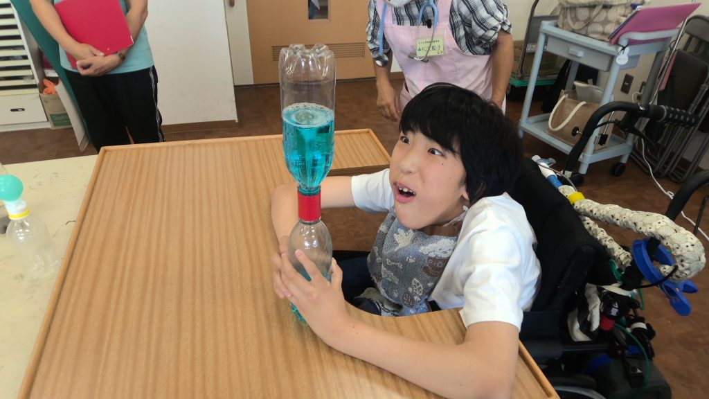 新年度に向けて、児童生徒に安全な食事支援ができるように職員研修を行いました。写真は、上を向いて水分を飲む体験をしているところです。のどがつっぱっていると、とても飲みづらいことを実感しました。